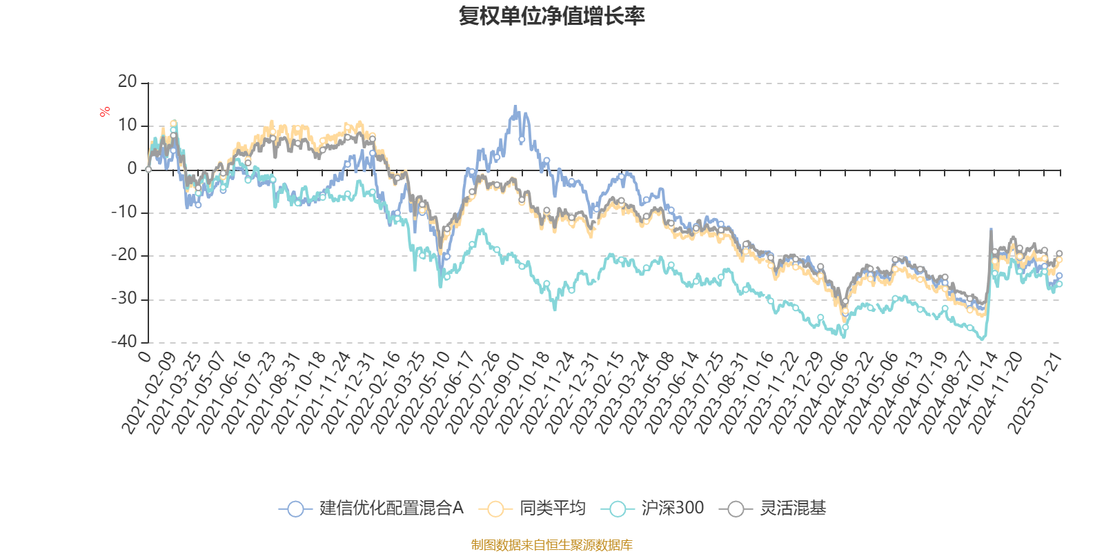 截至1月21日,建信优化配置混合A近三个月复权单位净值增长率为-6.19%,位于同类可比基金845/920;近半年复权单位净值增长率为2.23%,位于同类可比基金728/920;近一年复权单位净值增长率为5.74%,位于同类可比基金665/920;近三年复权单位净值增长率为-16.24%,位于同类可比基金312/898。